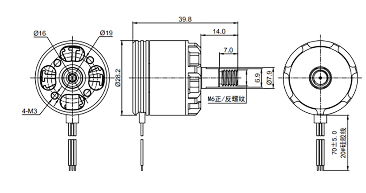 Трехфазный бесколлекторный мотор с внешним ротором, конструкция 12N14P, ориентирован на высокую тягу, длительное время работы и низкий уровень шума; подходит для тяжелых дальних полетов и профессиональной кино- и телеаэросъемки.