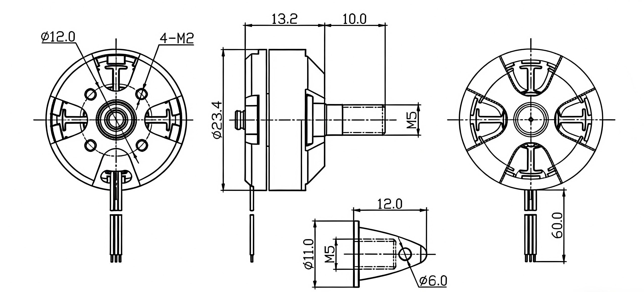 Трехфазный бесколлекторный мотор с внешним ротором, конструкция 12N14P, ориентирован на высокую тягу, длительное время работы и низкий уровень шума; подходит для тяжелых дальних полетов и профессиональной кино- и телеаэросъемки.