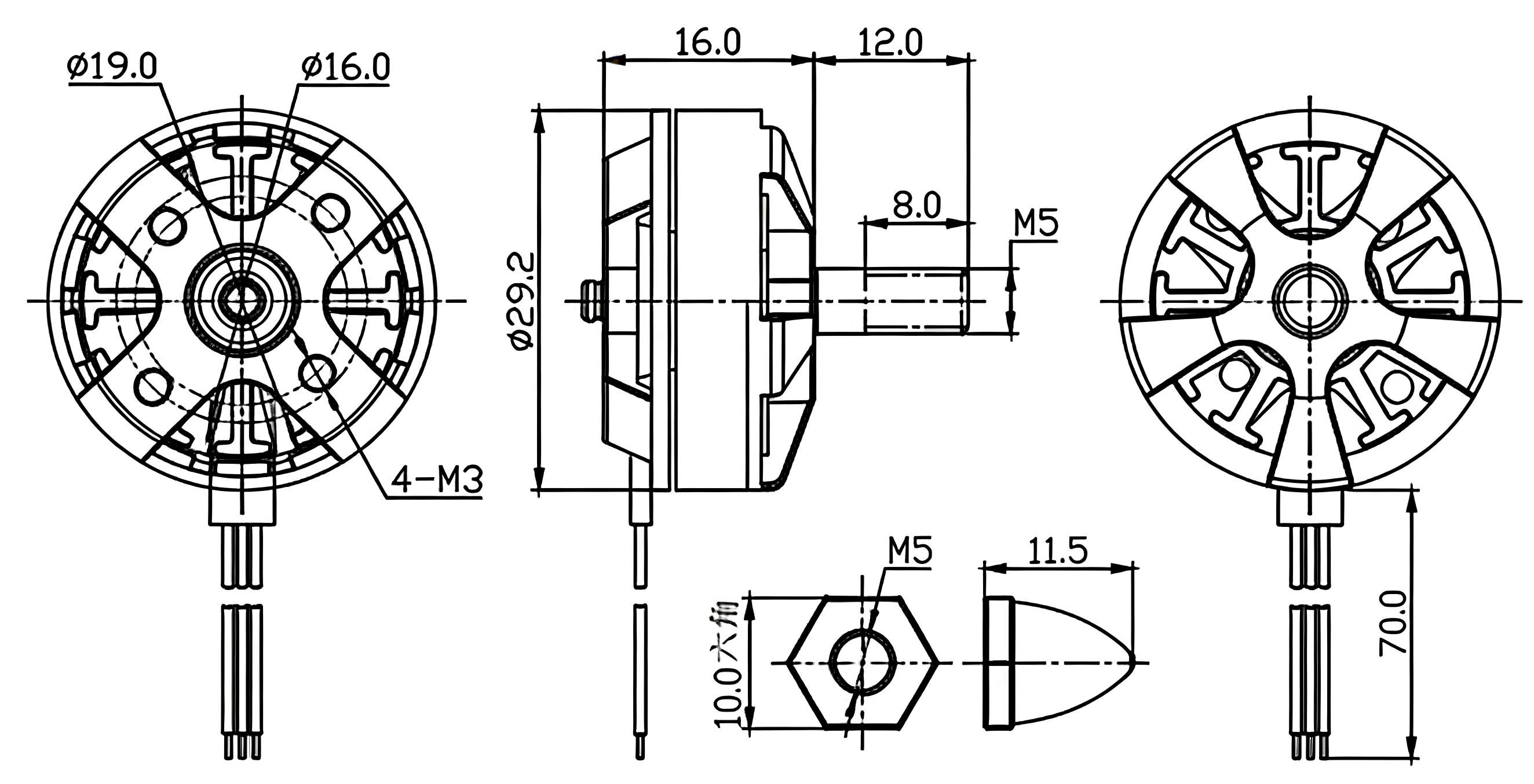 Трехфазный бесколлекторный мотор с внешним ротором, конструкция 12N14P, ориентирован на высокую тягу, длительное время работы и низкий уровень шума; подходит для тяжелых дальних полетов и профессиональной кино- и телеаэросъемки.